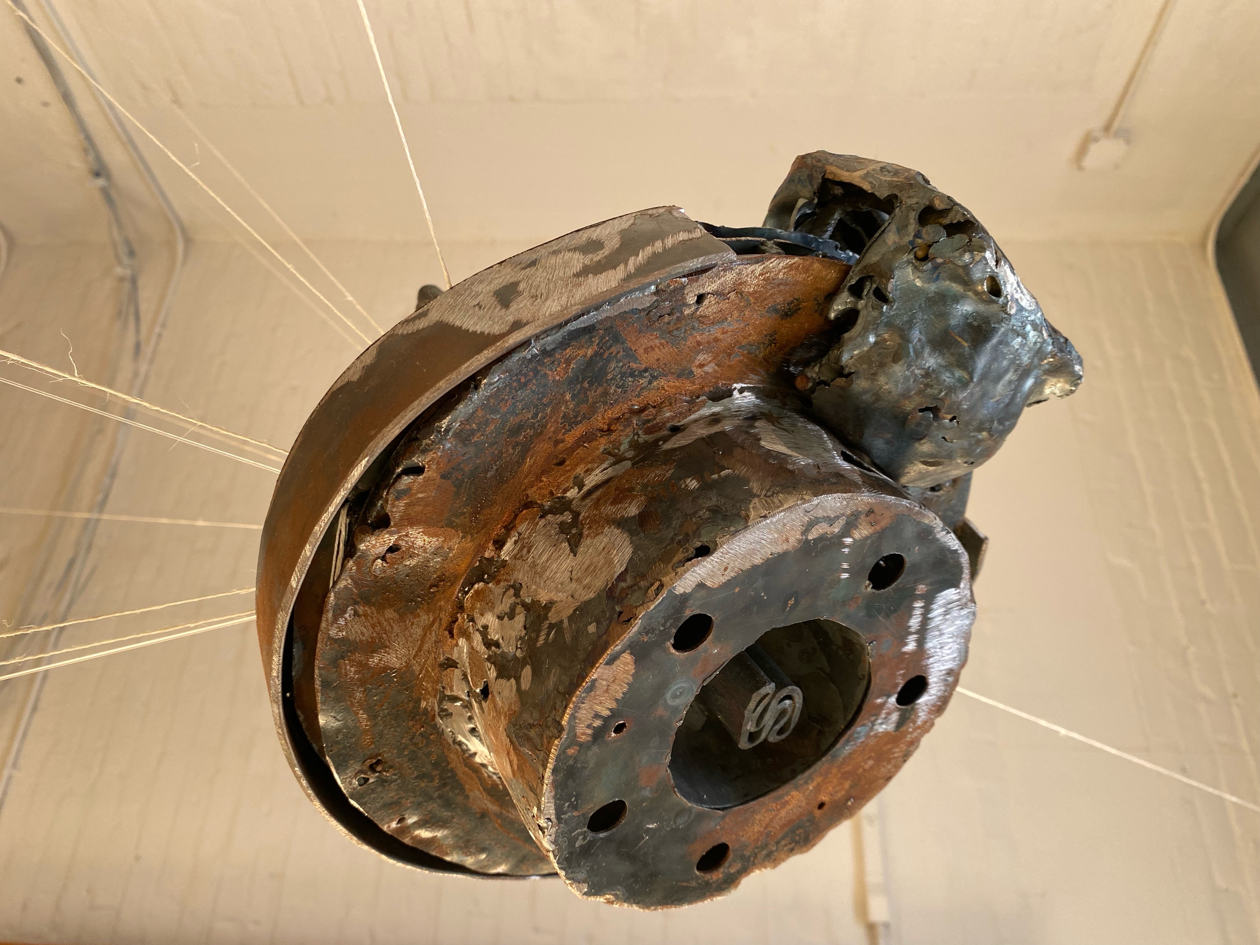 Fabricated based on the dimensions of brake components from a 1989 Volvo 240 Sedan, my first car. The brake parts are suspended in the same orientation as my Volvo was after flipping following a brake failure and subsequent crash while descending a steep mountain road in September of 2022.