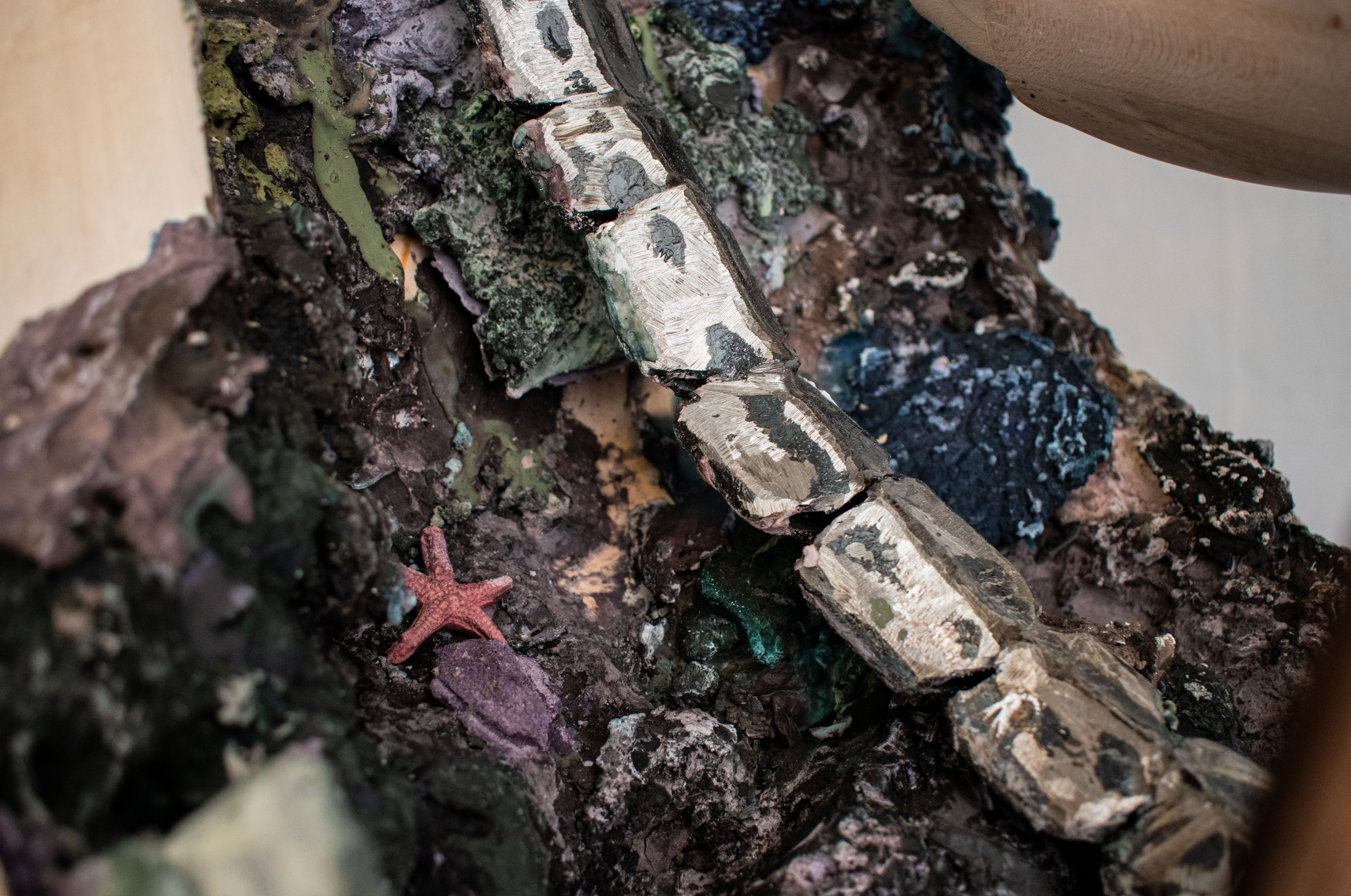 Inspired by formational memories from childhood, this sculpture embodies the experience of searching within a tide pool. The impermanence and complexity of these tiny ecosystems resembles other networks in flux; from our formation of identity to neural and cosmic networks, our world is composed of ever changing interconnected systems, as is miraculously reflected amongst the hermit crabs.
